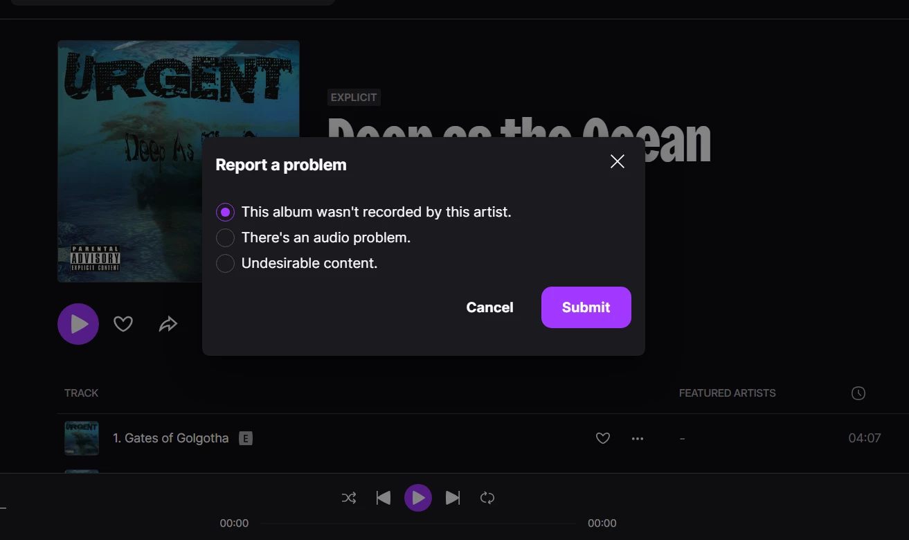 Wrong artist ,wrong album ,missing album ,wrong title ,track missing ,wrong label ,wrong name ,wrong song  and wrong bio you can report in link below