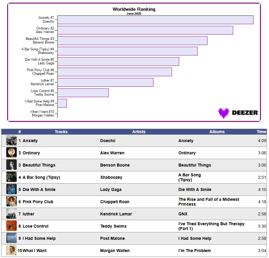 🏆 🌎 Worldwide Ranking on Deezer June 2025 📈