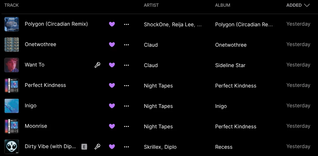 when i add tracks to my favourites list on my computer (in the browser or on the windows desktop app), they don’t show up in that position on my android phone. the screenshots below are taken at the same time, the playlist, in both cases, is sorted to show recent additions on top. as you can see, the songs by claud and night tapes are missing on my phone even though i’ve added them in between “poligon” and “dirty vibe” on my computer. i have added the songs hours ago. all devices have an internet connection. my favourites list looks the same across browser and desktop app but different on my phone.