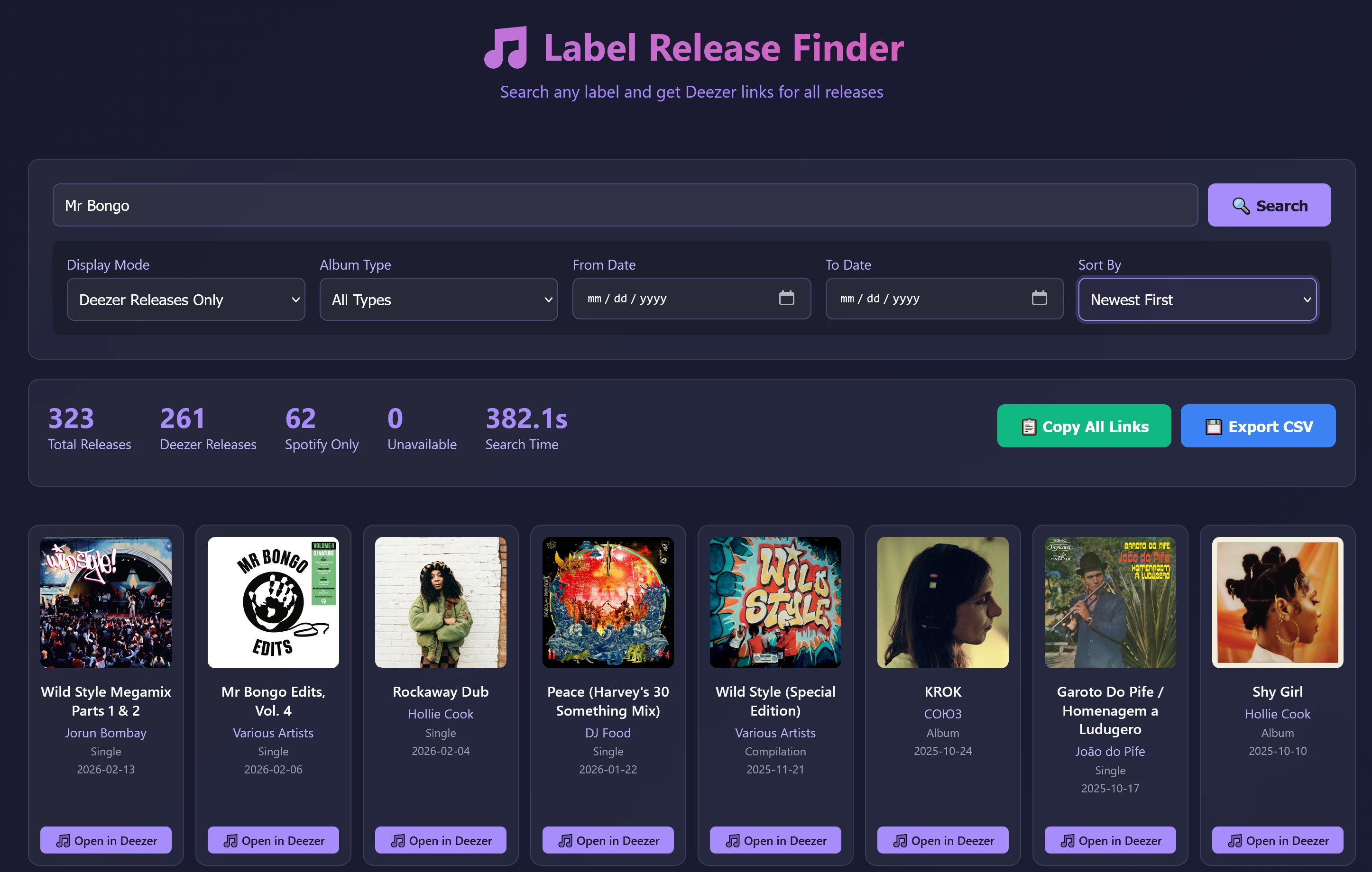 Since I didn’t know if this feature would ever be brought back, I had a script/web front end interface written to perform label searches. While it’s not as fast/immediate as the built in search was, it might actually be more complete. When researching I found Deezer’s API to be unreliable in regards to aggregating label releases. I discovered a site called lbl.fm (find releases by label) and noticed they were using Spotify’s API, which is much more comprehensive in this regard. I then took the results generated from Spotify, matched UPC codes to create Deezer links to be displayed on a front end. This route requires running a server to keep the Spotify API token active to perform these searches, so it’s not very user friendly but it gets the job done.