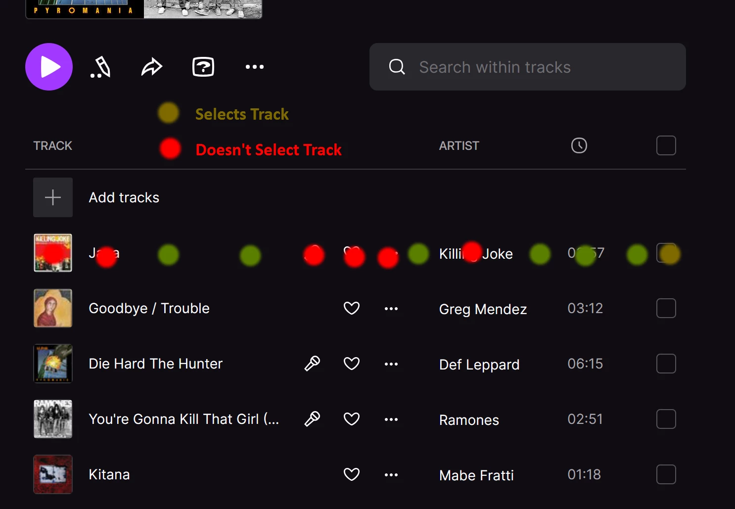 Very small request. When I’m clicking multiple tracks on a playlist, if I miss the checkbox even by a little, it doesn’t do anything. It’d be nice if it selected if I clicked anywhere on the row.