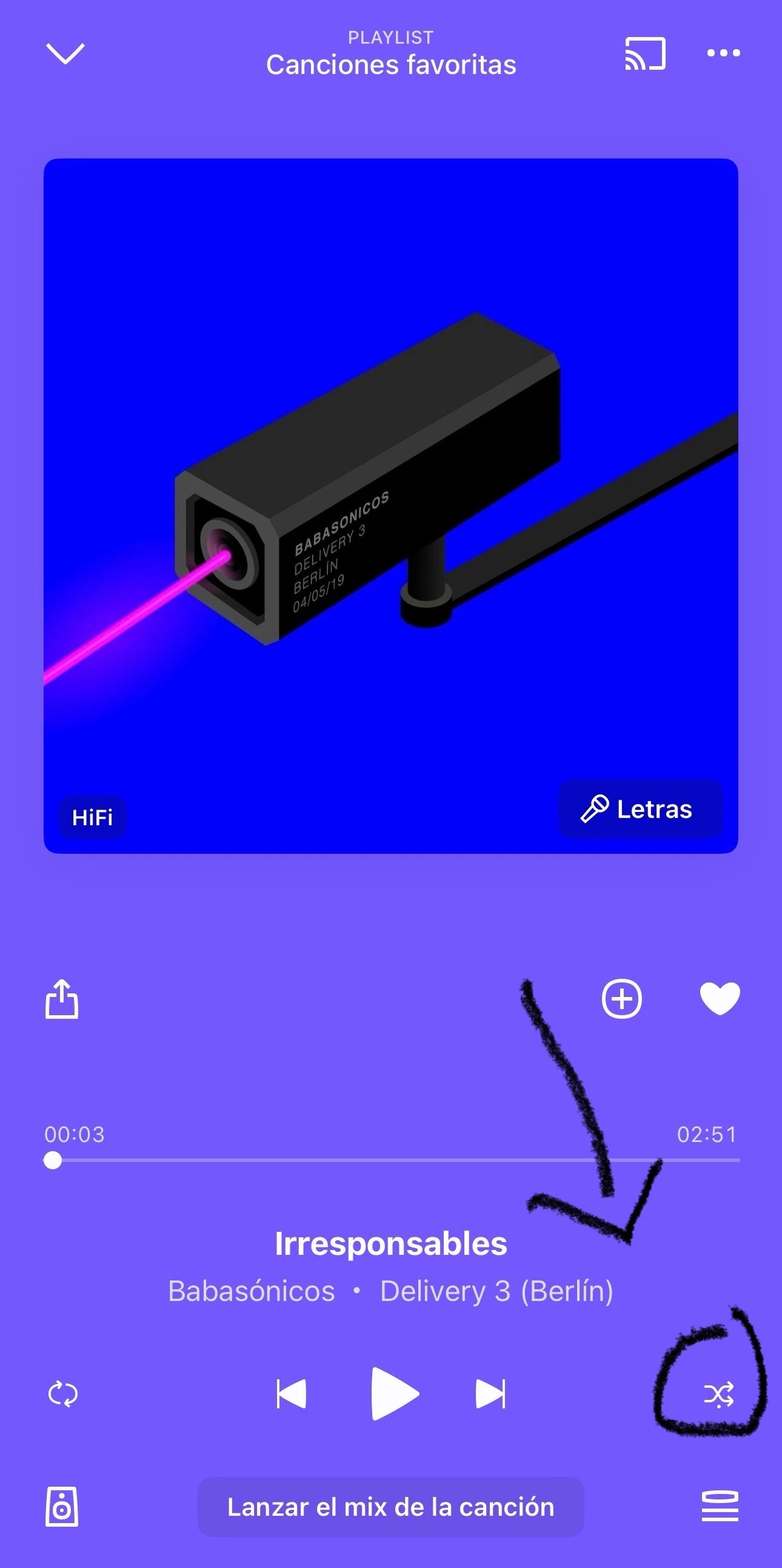 The Shuffle button in “blue” activates the playing of the tracks in shuffle mode, so all the tracks will start to play on shuffle mode. If you need to deactivate/activate the shuffle mode, you can click on the little shuffle button at the right bottom corner in your player screen on the app 😁