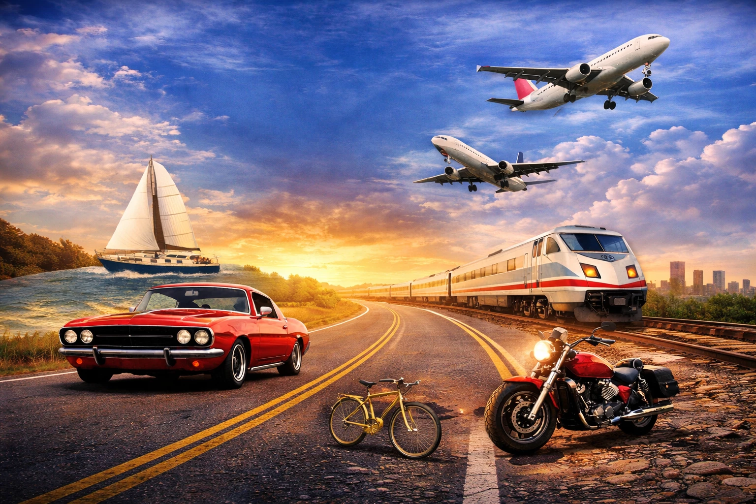 Think bicycle, car (and car brands), motorcycle, train, plane, ship,