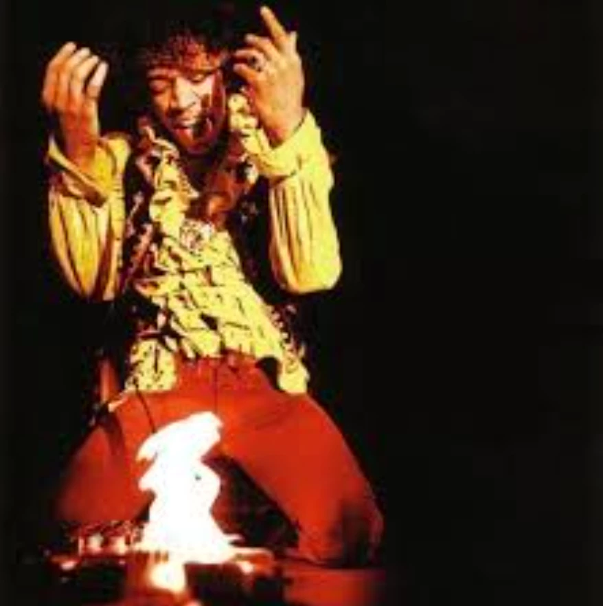 The dramatic moment when Hendrix set his Fender Stratocaster ablaze during his legendary performance, symbolising rock's destructive creative power and countercultural rebellion.