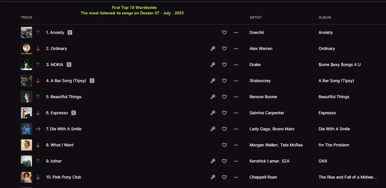💜 Deezer Charts : First Top 10 Worldwide 07/07/2025