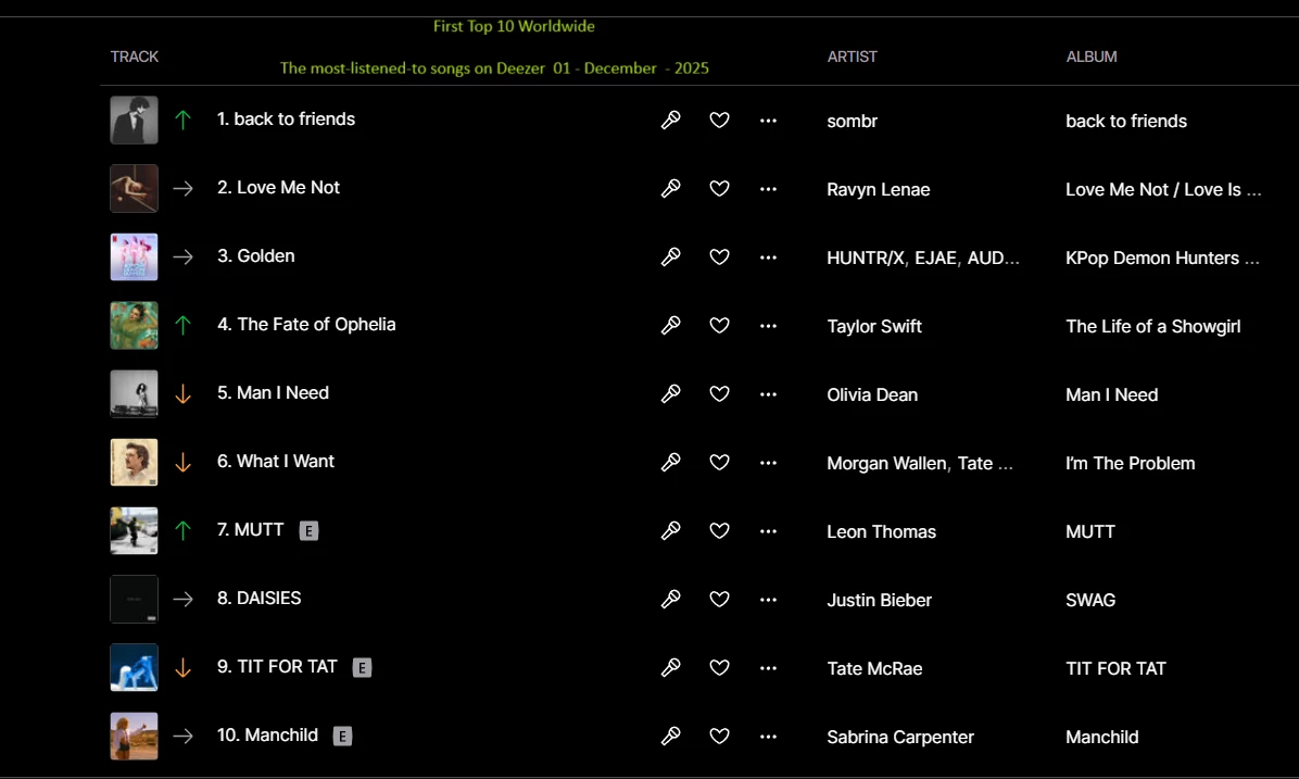 The most-listened-to songs on Deezer  01 - December  - 2025