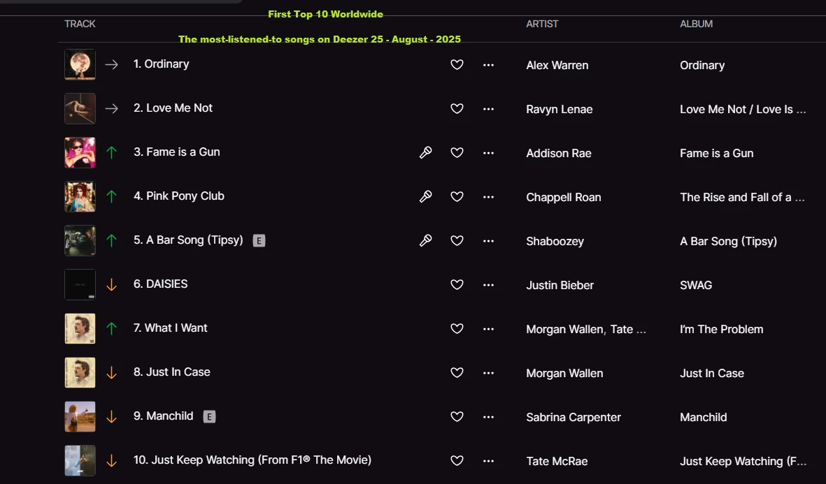 The most-listened-to songs on Deezer 25 - August - 2025