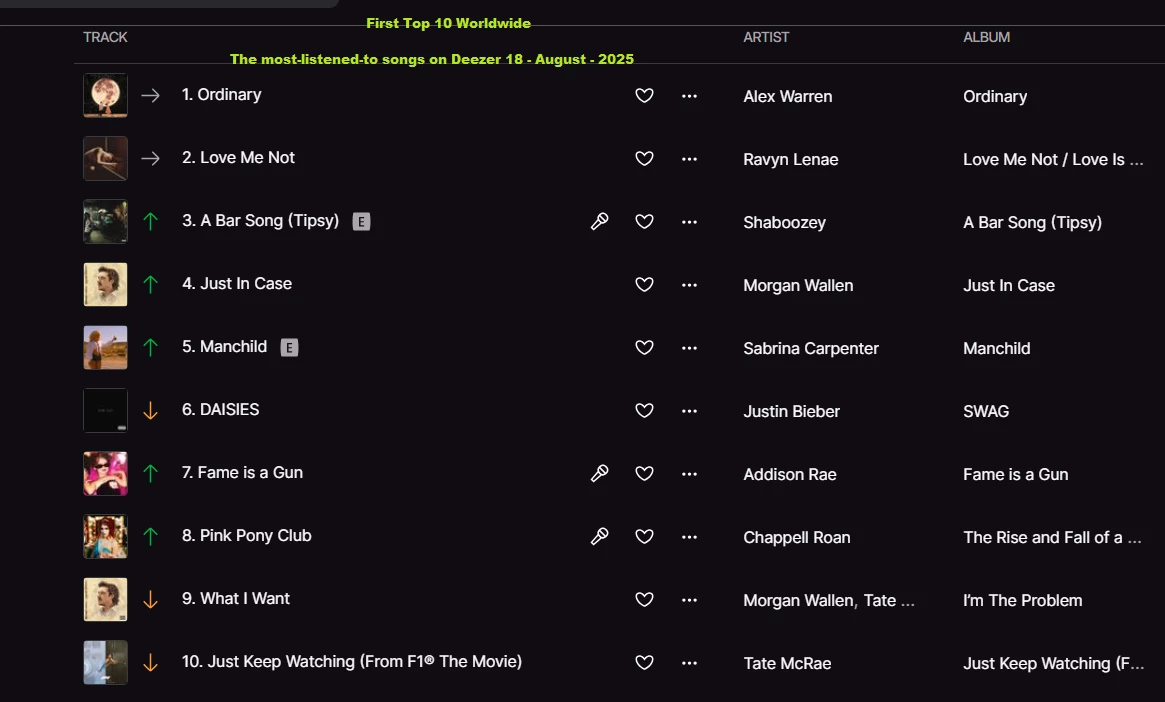 The most-listened-to songs on Deezer 18 - August - 2025