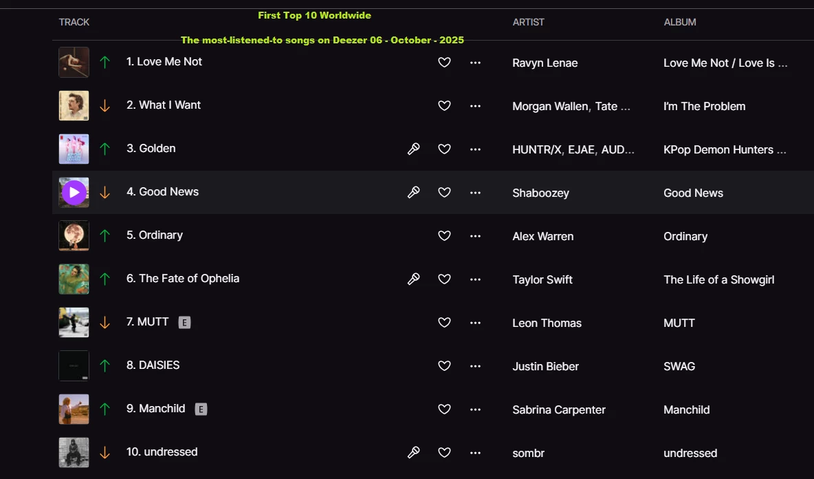 The most-listened-to songs on Deezer 06 - October - 2025