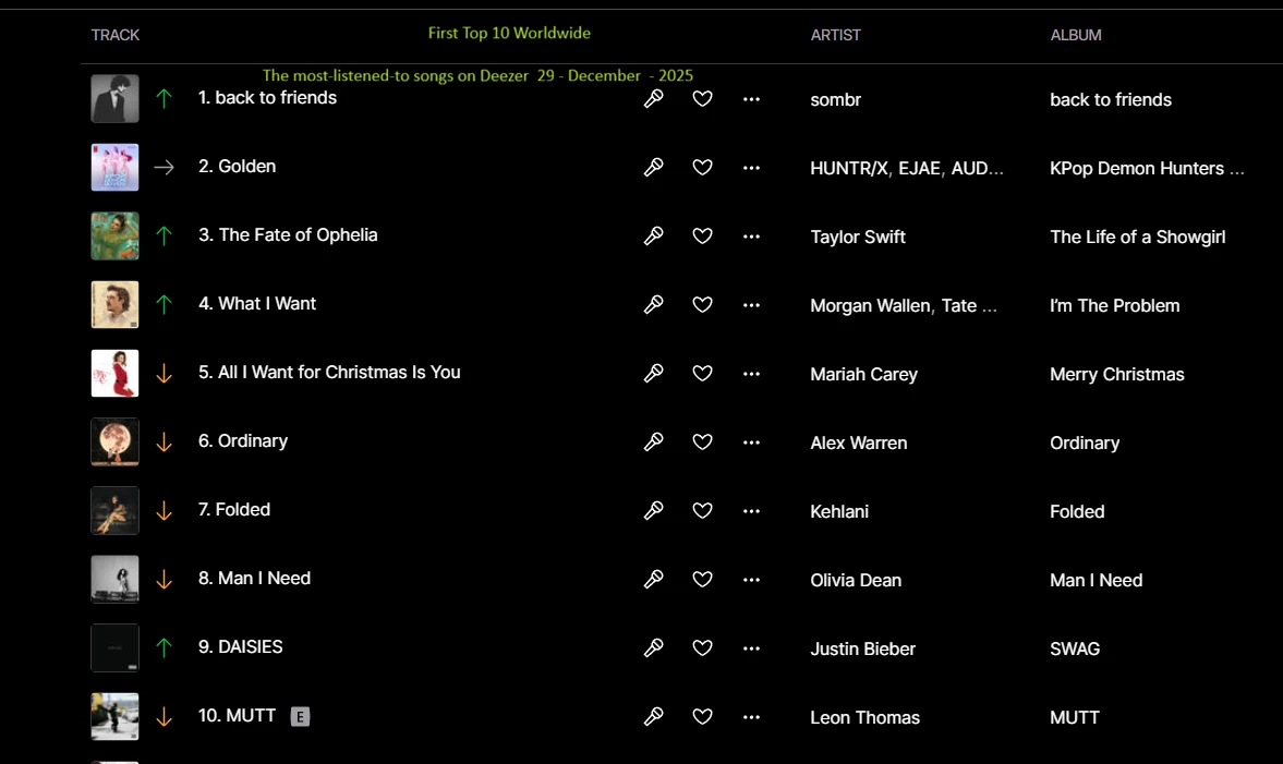 The most-listened-to songs on Deezer  29 - December  - 2025