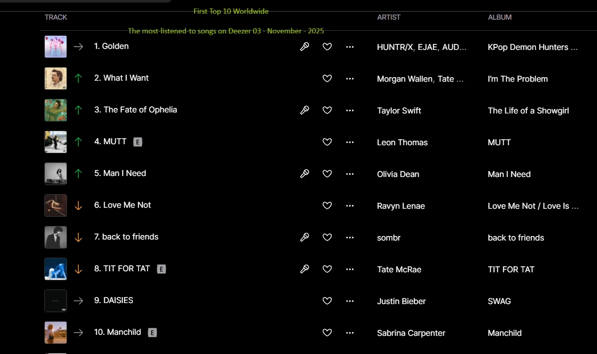 The most-listened-to songs on Deezer 03 - November - 2025