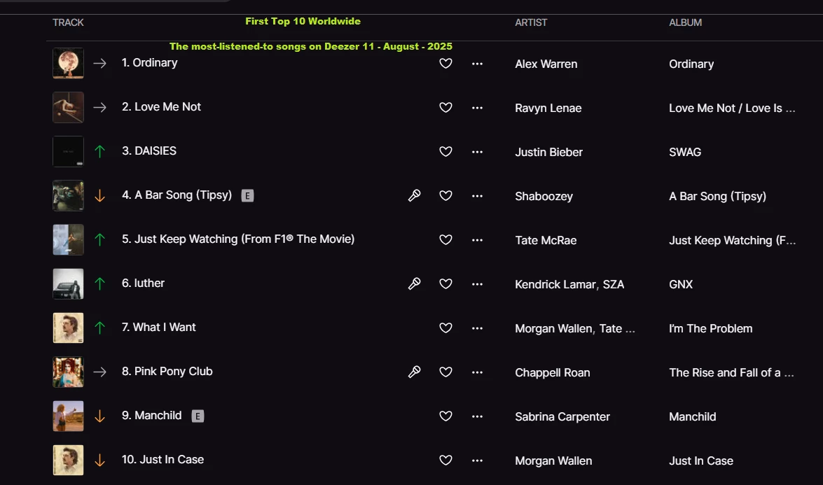 The most-listened-to songs on Deezer 11 - August - 2025