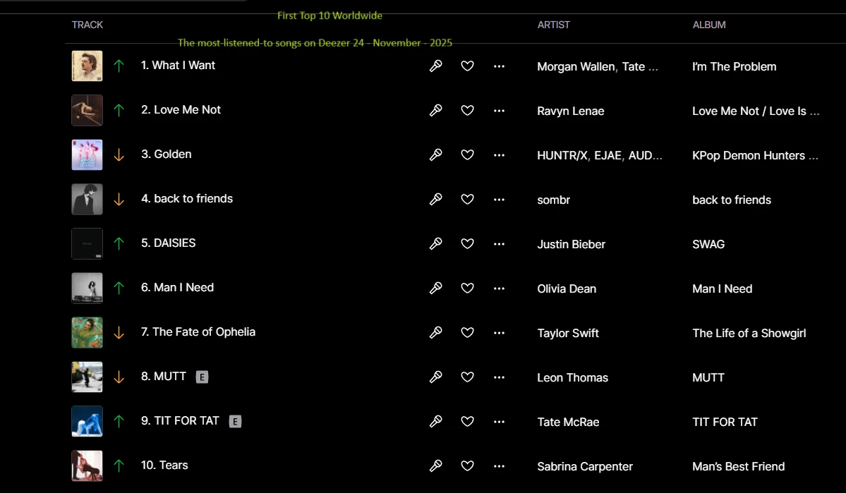 The most-listened-to songs on Deezer 24 - November - 2025