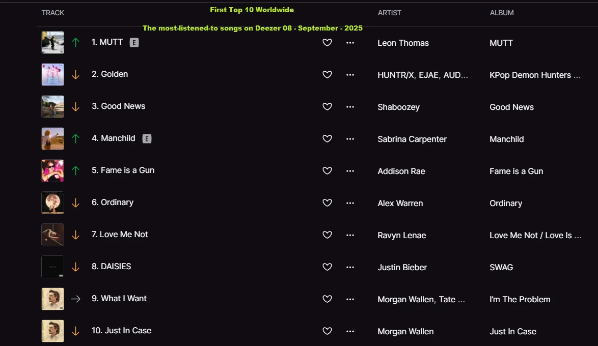 The most-listened-to songs on Deezer 29 - September - 2025