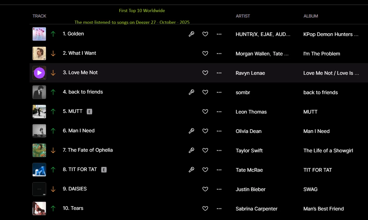 The most-listened-to songs on Deezer 27 - October - 2025