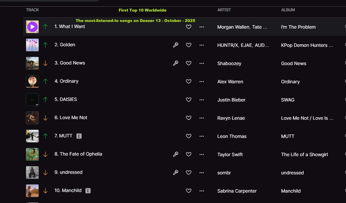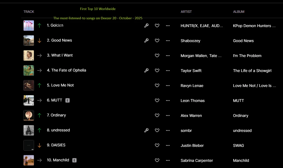 The most-listened-to songs on Deezer 13 - October - 2025