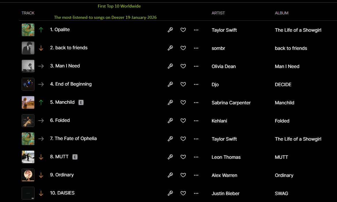 The most-listened-to songs on Deezer 19-January-2026