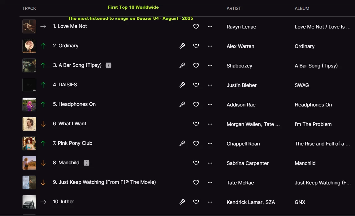 The most-listened-to songs on Deezer 04 - August - 2025