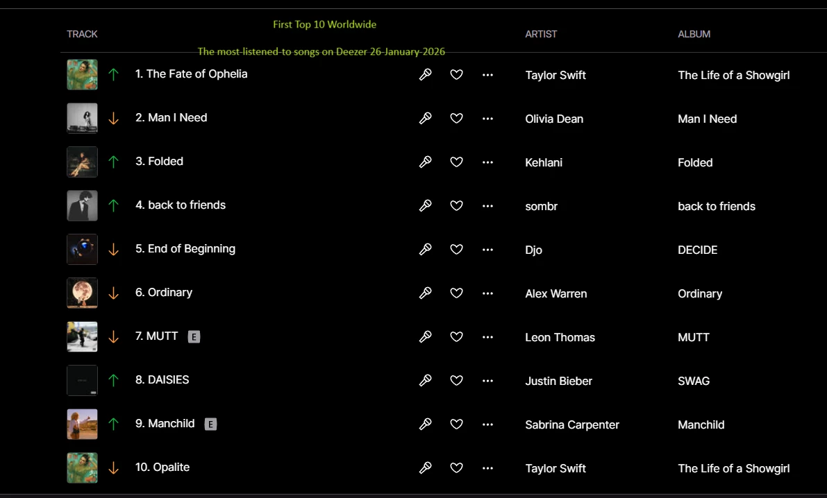 The most-listened-to songs on Deezer 26-January-2026