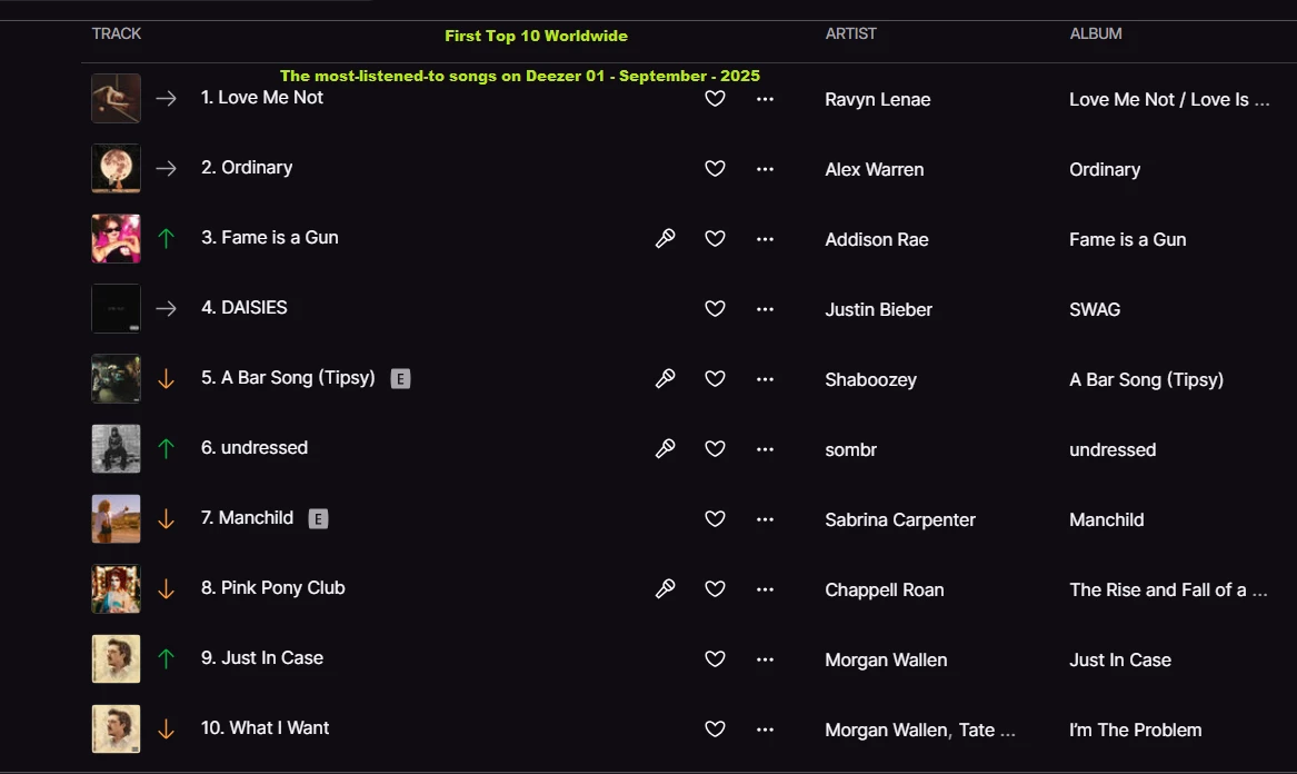 The most-listened-to songs on Deezer 15 - September - 2025