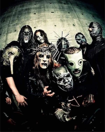 Slipknot: This heavy metal band is is instantly recognizable for their elaborate, horror-inspired masks and matching stage outfits, emphasizing their dark and aggressive musical style.