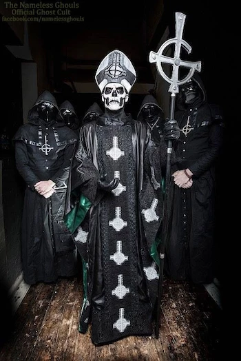 Ghost: This Swedish rock band known for combining costumed theatricality on-stage presence. Ghost's members, except for the lead vocalist, are known as "Nameless Ghouls". The lead-singer has performed under the persona of "Papa Emeritus", a character known for its anti Pope demonicย imagery, while changing this for subsequent tours.