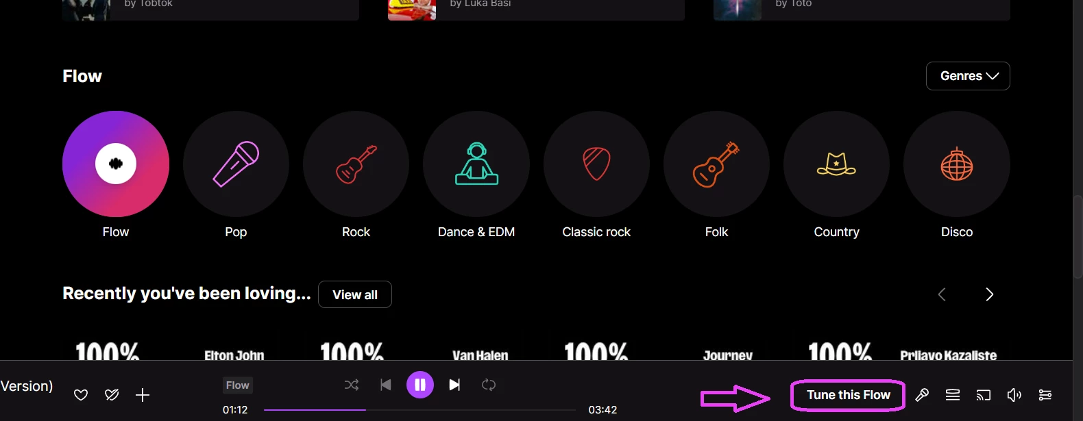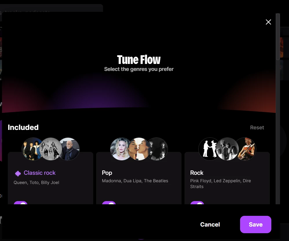 Choose the genres for your flow: Turn on what you want to listen to more often,